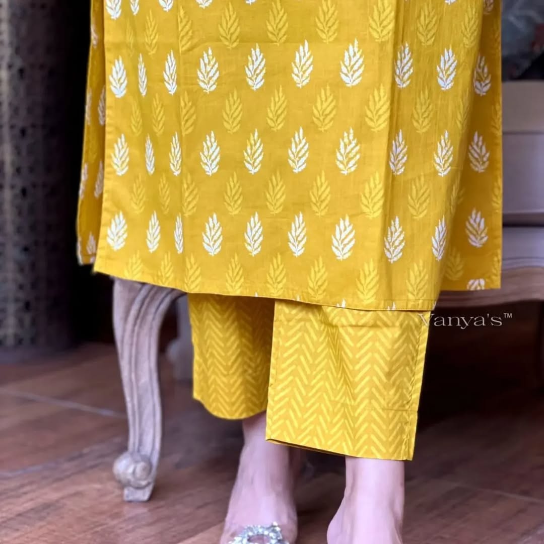 The soft, warm quilted jacket is designed with intricate stitching and button detailing, adding a classy touch while keeping you cozy. The kurti features a traditional handblock-style motif print in a bright festive yellow shade, perfect for winter outings, office wear, or casual gatherings.