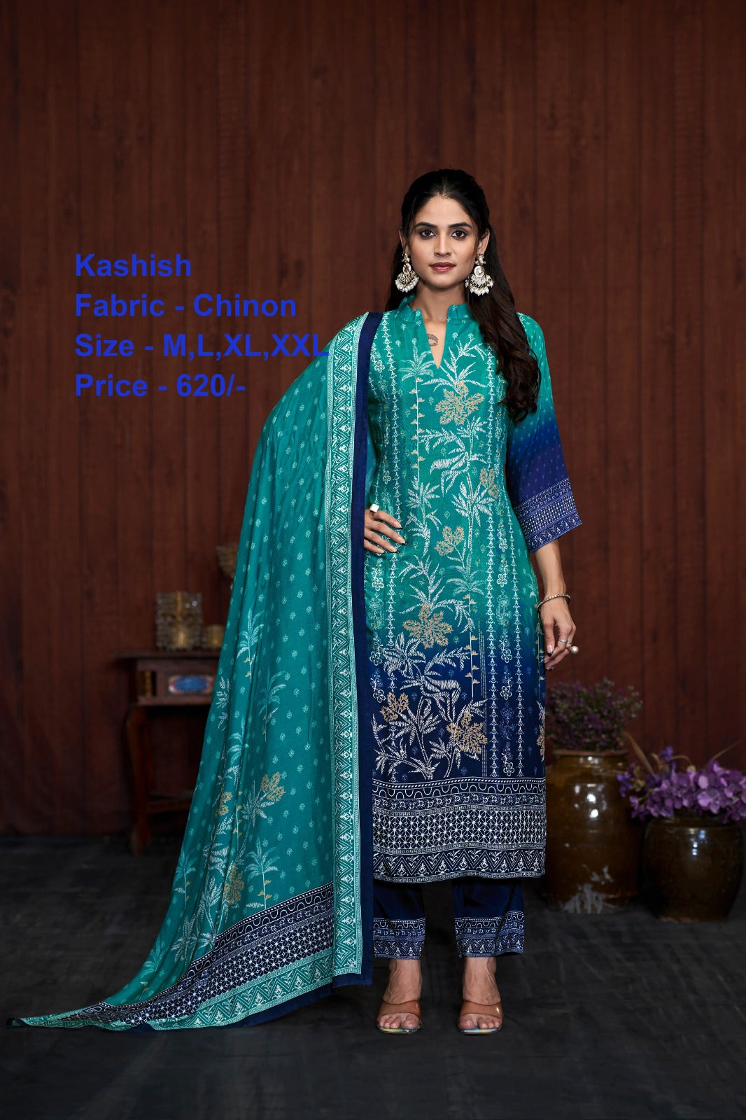 Step into elegance with this Kashish Chinon 3 Piece Kurti Set, designed for women who love a perfect blend of tradition and modernity. Crafted from premium quality Chinon fabric, this outfit ensures a graceful drape and a comfortable fit for all-day wear.