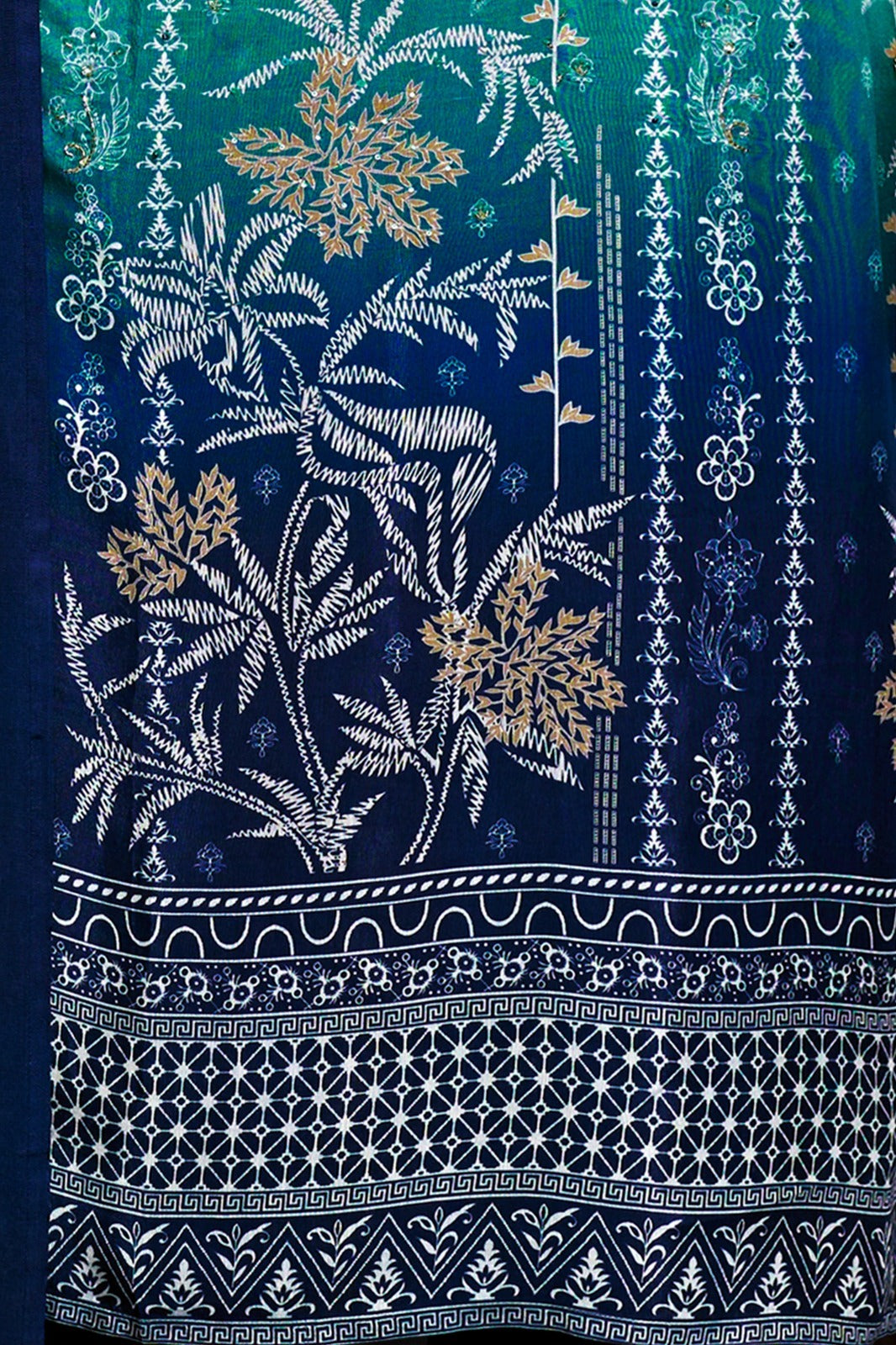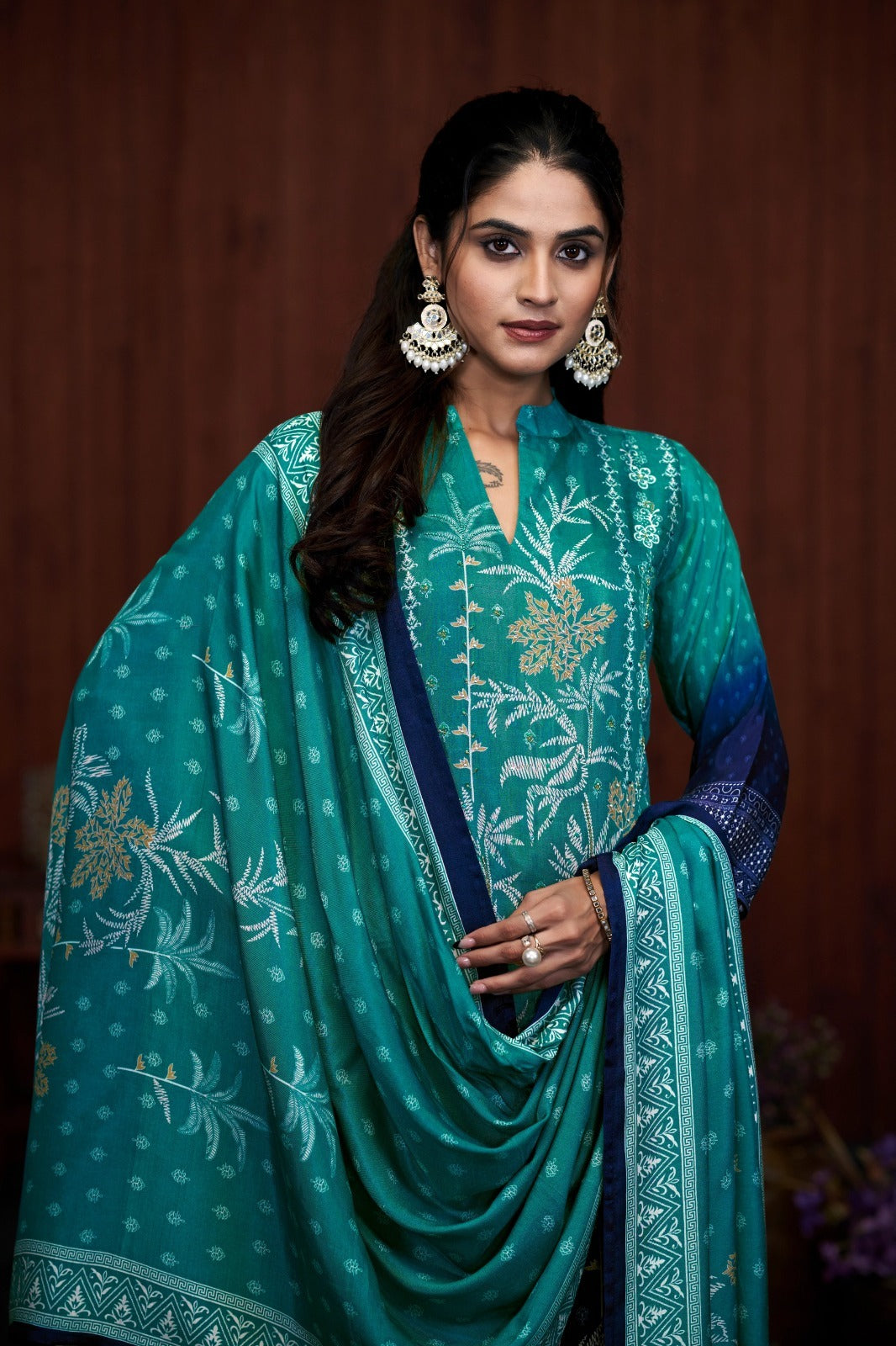 The set includes a beautifully printed kurti with intricate floral and ethnic motifs, matching bottoms, and a coordinated dupatta that enhances its sophisticated charm. The soothing teal and navy blue tones with delicate patterns make it a versatile choice for festive occasions, family gatherings, or casual celebrations.