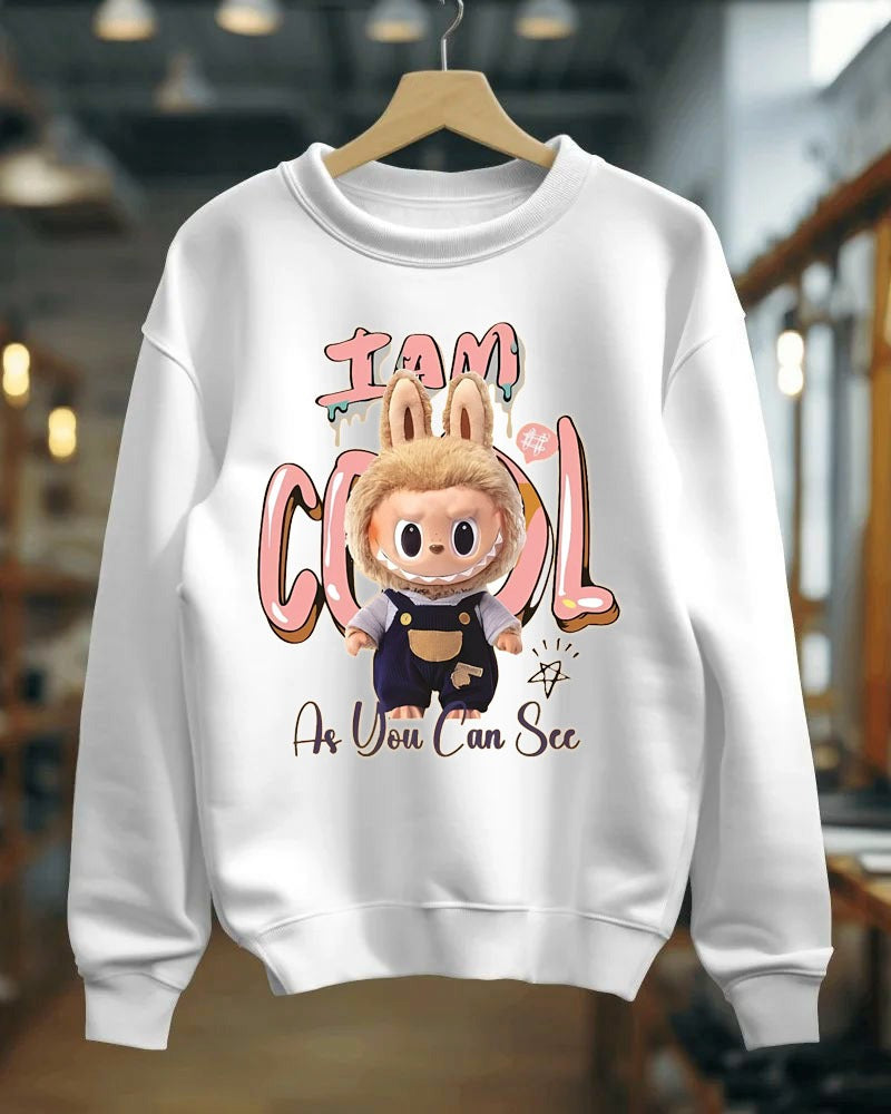 • Adorable 3D cartoon graphic featuring a cute bunny-eared character and fun “I Am Cool – As You Can See” text print.