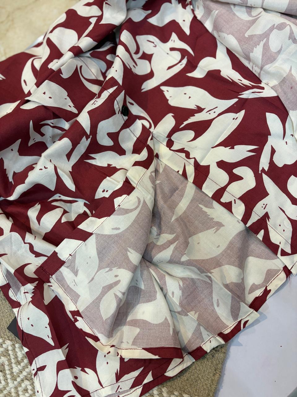 - Color & Print: Rich rust brown base with ivory abstract pattern