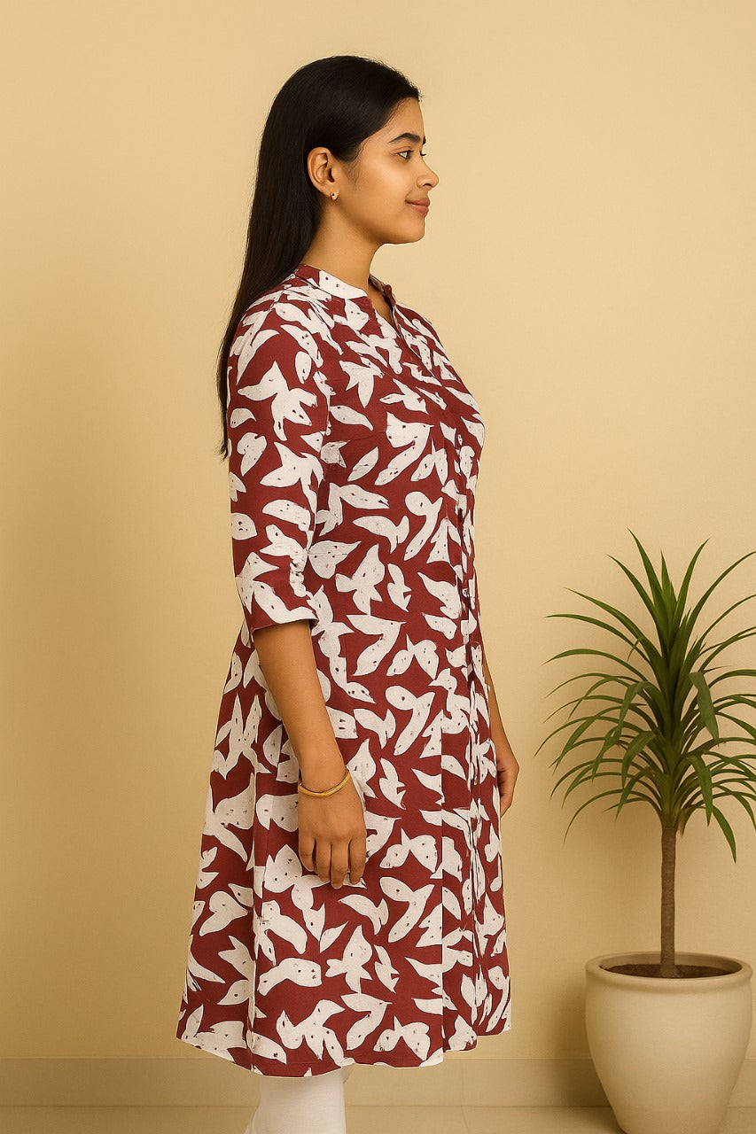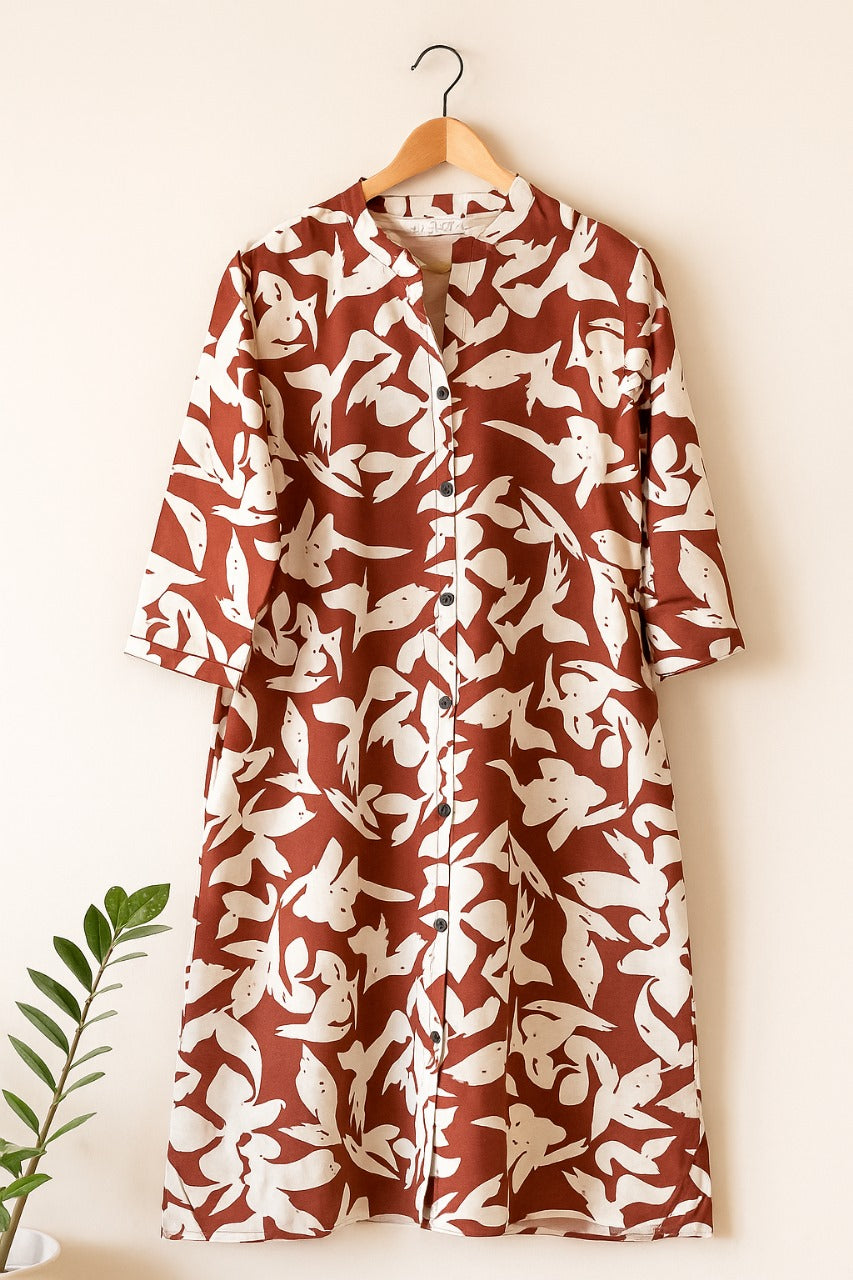 Step into effortless sophistication with this Rust Ivory Abstract Print Rayon Kurti, crafted from premium-quality rayon fabric for all-day comfort and style. Designed with a modern button-down front closure and a smart mandarin collar, this kurti combines contemporary fashion with timeless ethnic charm.